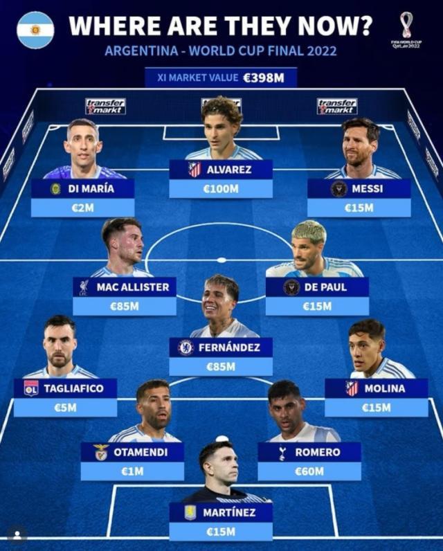 12月19日訊 阿根廷在3年前贏得了世界杯冠軍,《轉會市場》也追蹤了阿根廷決賽首發11人的當前情況。