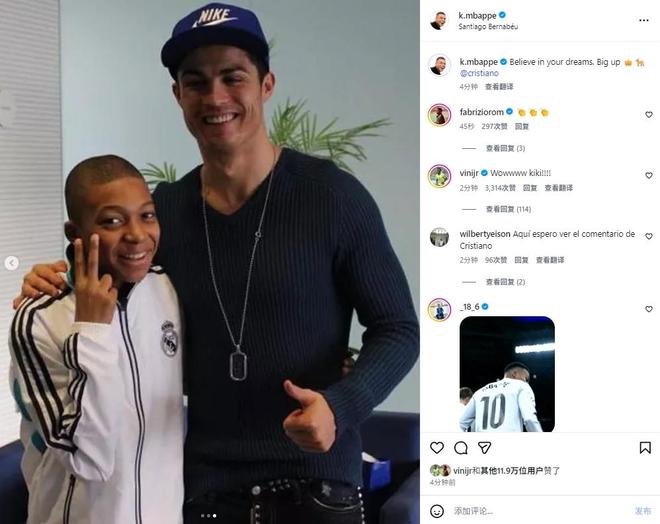 賽后,姆巴佩更新社媒,發布了本場比賽自己進球后模仿C羅慶祝的圖片和自己少年時與C羅的合影,并配文道:“相信你的夢想。致敬王者。”