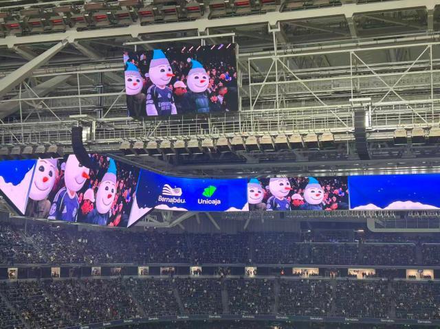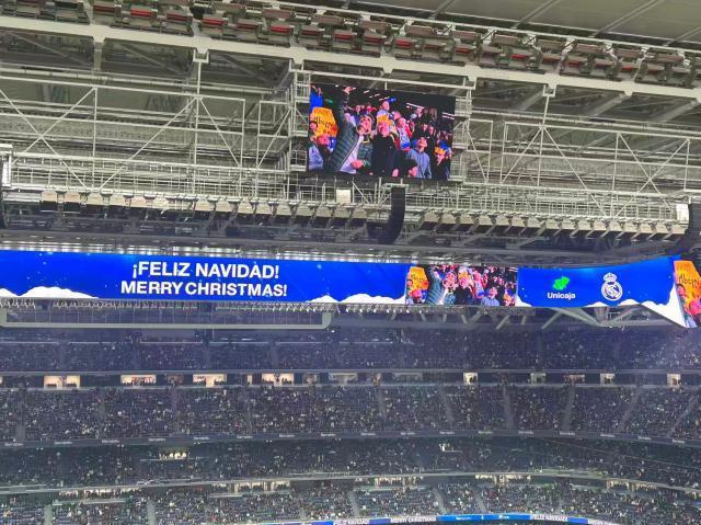 圣誕節(jié)將至,馬德里市中心擠滿了出門采購的本地居民和外來游客,伯納烏球場也迎來皇馬戰(zhàn)塞維利亞的2025年收官之戰(zhàn)。之前的連續(xù)兩個主場比賽,皇馬先是在聯(lián)賽中連吃兩紅牌被塞爾塔掀翻,隨后又在場面不算差的情況下輸給曼城,用主場勝利為2025收官,不僅是保住阿隆索帥位的根本,也是對幾乎坐滿全場的皇馬球迷的最好回饋。和馬德里街頭琳瑯滿目的圣誕彩燈一樣,伯納烏在圣誕前最后一戰(zhàn)的賽前儀式中也將節(jié)日氛圍拉滿,現(xiàn)場屏幕給到的球迷鏡頭中,都被加上了圣誕帽和圣誕老人裝束的AI特效,現(xiàn)場DJ也為所有來現(xiàn)場觀賽的球迷送出了祝福,并循環(huán)播放起圣誕主題歌曲,伴隨著讓人目不暇接的現(xiàn)場燈光秀和首發(fā)陣容報送。